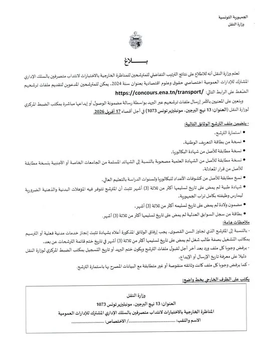 بلاغ بالمناظرة الخارجية بالإختبارات لانتداب 06 متصرفين بالسّلك الإداري المشترك للإدارات العمومية بوزارة النّقل.