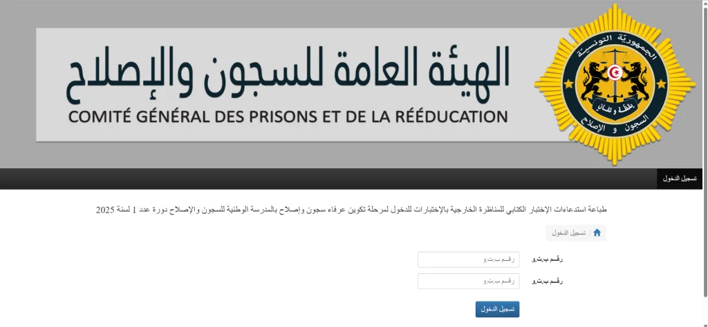 طباعة استدعاءات الإختبار الكتابي للمناظرة الخارجية بالإختبارات للدخول لمرحلة تكوين عرفاء سجون وإصلاح بالمدرسة الوطنية للسجون والإصلاح دورة عدد 1 لسنة 2025