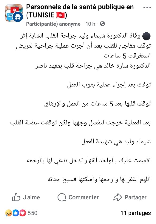 وتناقلت السوشيل ميديا أحداث موت جندية “الجيش الأبيض”، إذ أوردت صفحات تونسية أن الطبيبة شيماء غادرت الحياة بسبب توقف مفاجئ للقلب وذلك أثر انتهائها من إجراء عملية جراحية لمريض كانت قد استغرقت 5 ساعات في إحدى مستشفيات تونس.
