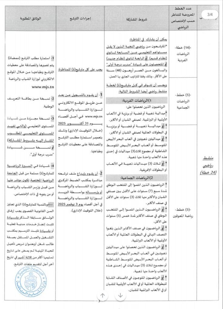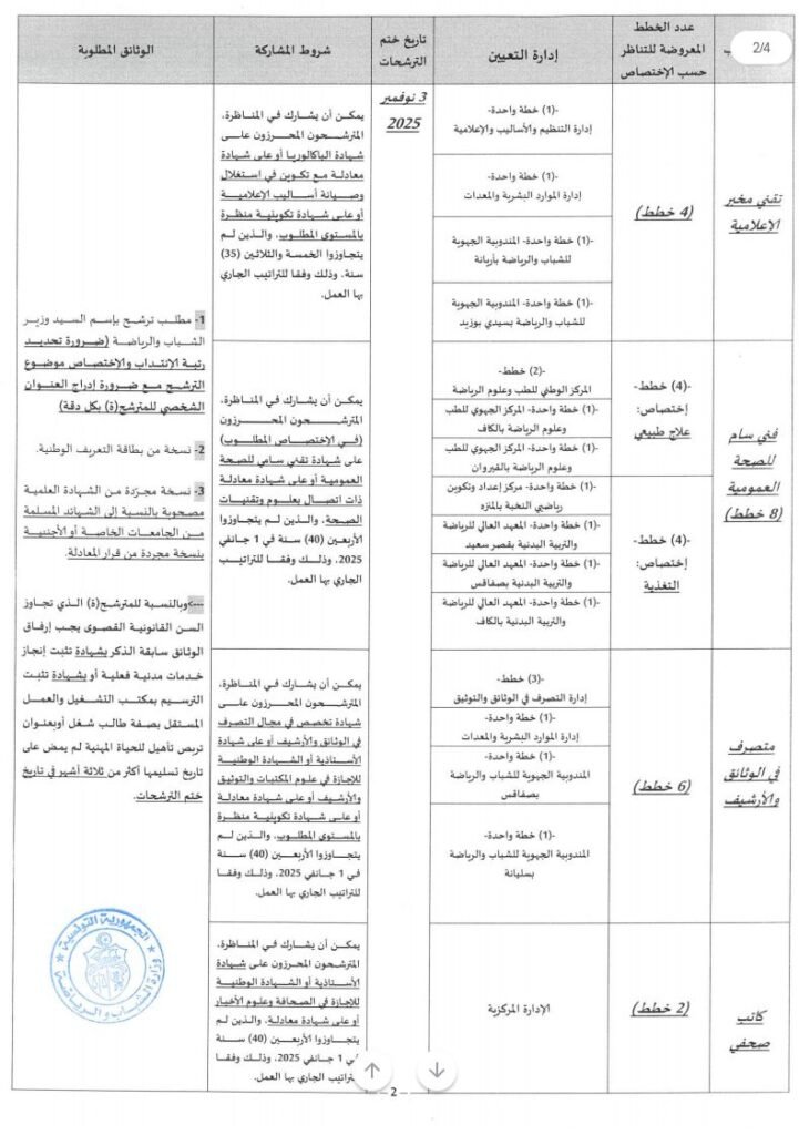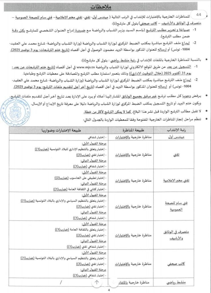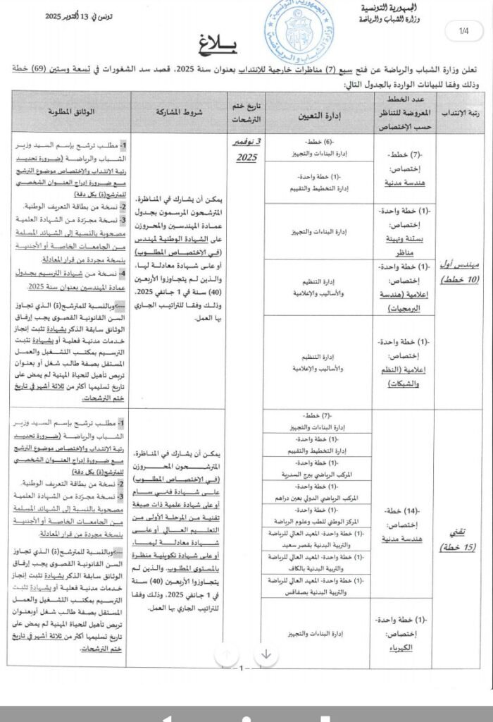كشفت وزارة الشباب والرياضة في بلاغ لها عن فتحها 7 مناظرات خارجية بالاختبارات بعنوان سنة 2025 لانتداب 69 خطة في عدة إختصاصات محددة مجالات كل رتبة وطريقة الترشح.